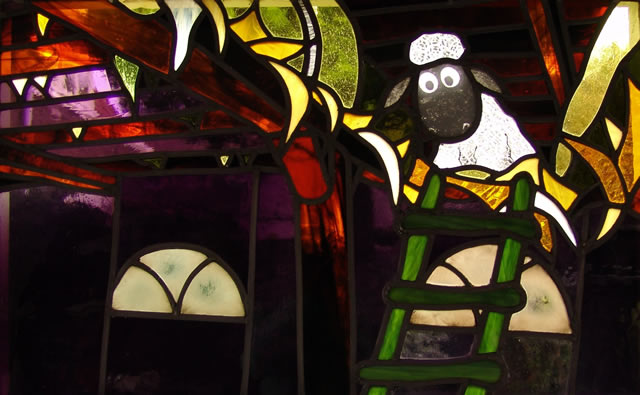 ![]() Glas in lood met Shaun the Sheep op hooizolder |