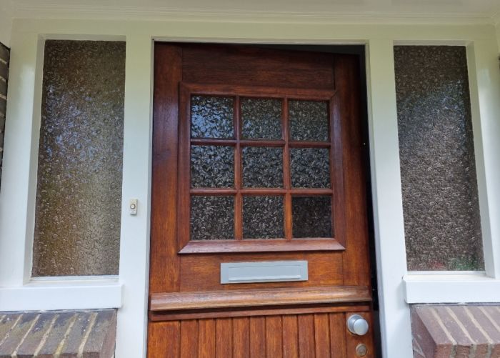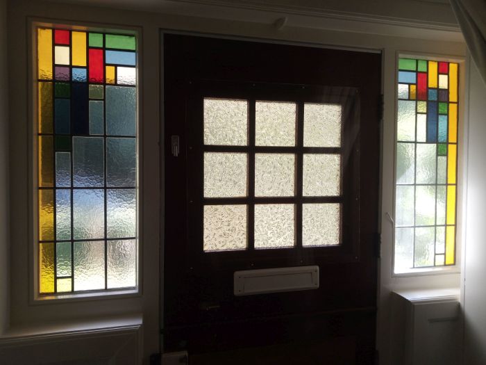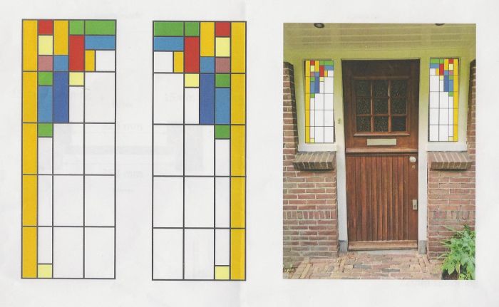 | Glas in lood in isolerend dubbelglas naast de voordeur |